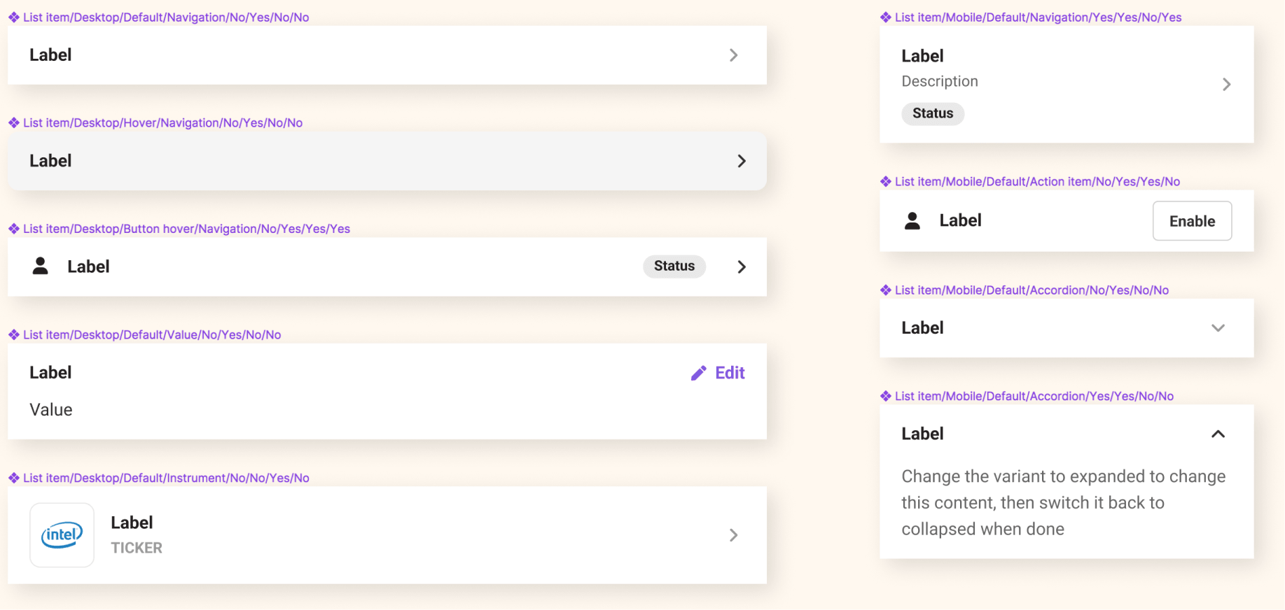 Many UI elements needed a clean-up after they were introduced inconsistently over time. One of them was the list component, which I revisited as a design pattern. I reviewed all instances of the element and defined it’s appearance and behaviours depending on the use case and according to accessibility standards.