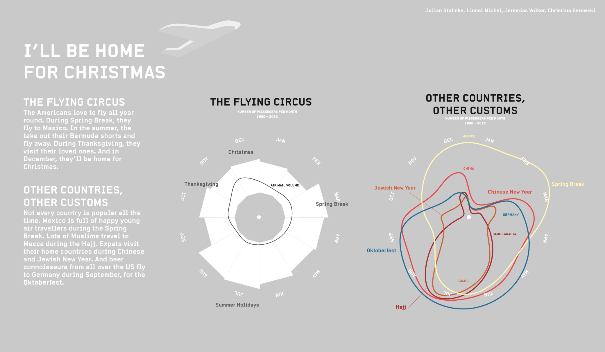 Our goal was to identify patterns and anomalies in the data that would correlate with well-known world events. After compiling a list of potential events, we meticulously examined the data, isolating those instances that exhibited clear patterns or disruptions. The most compelling narratives emerged when the data was easily interpretable or when it yielded captivating visuals, enticing the audience to delve deeper. We titled the poster ‘I’ll Be Home for Christmas,’ drawing from worldwide recurring events and customs as the foundation of our storyline.